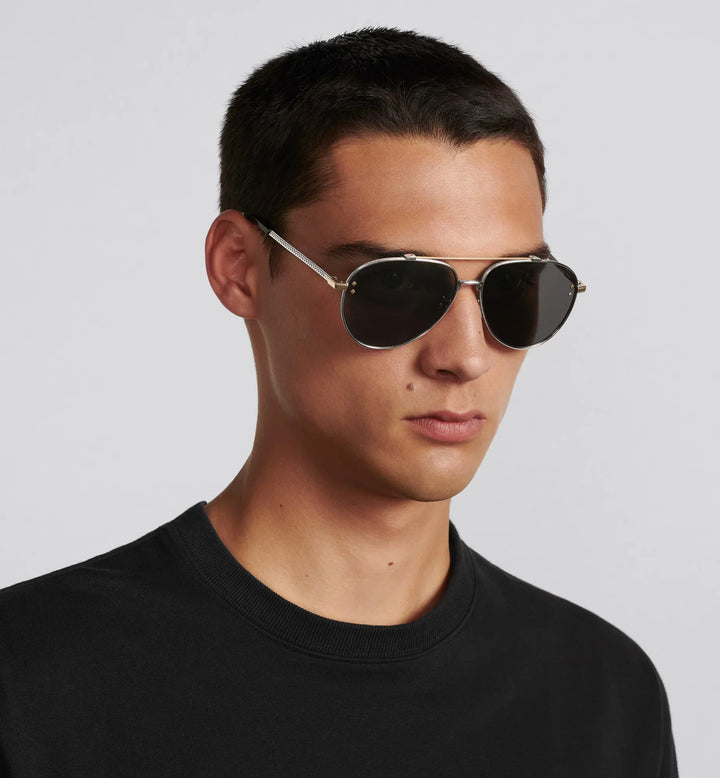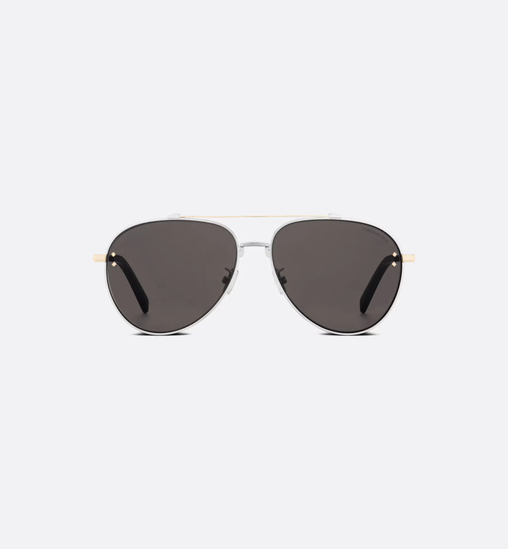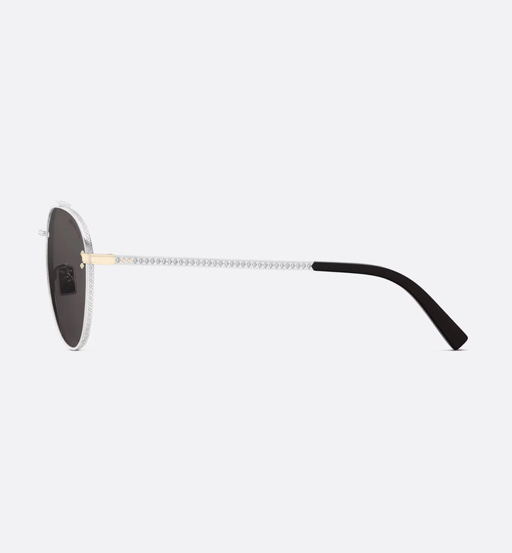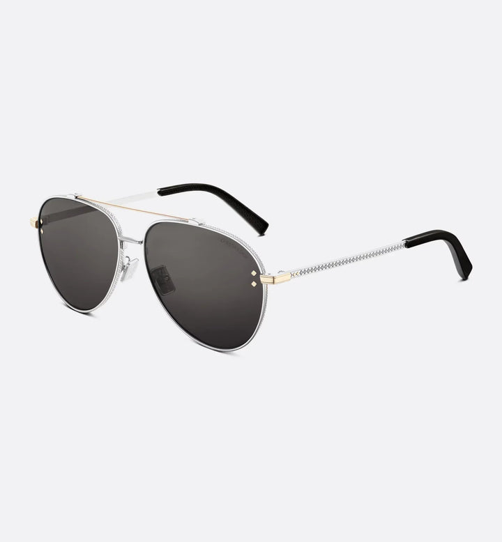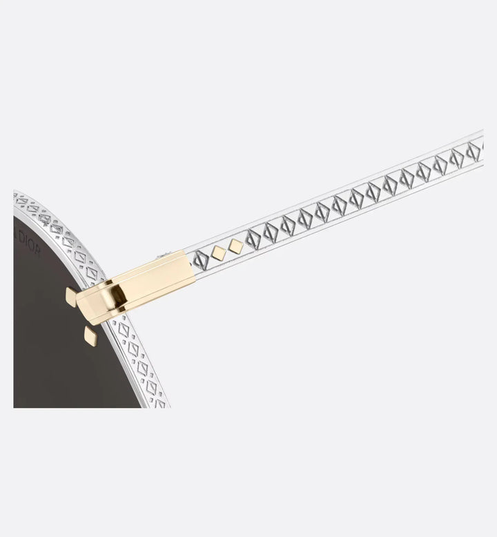 The CD Diamond A1U sunglasses elevate the line with a new metallic concept. The silver-finish metal pilot frame stands out with delicate engraving around the gray lenses and on the temples, showcasing a CD Diamond motif. Diamond details and a Christian Dior signature on the left lens complete the style's tailoring spirit.