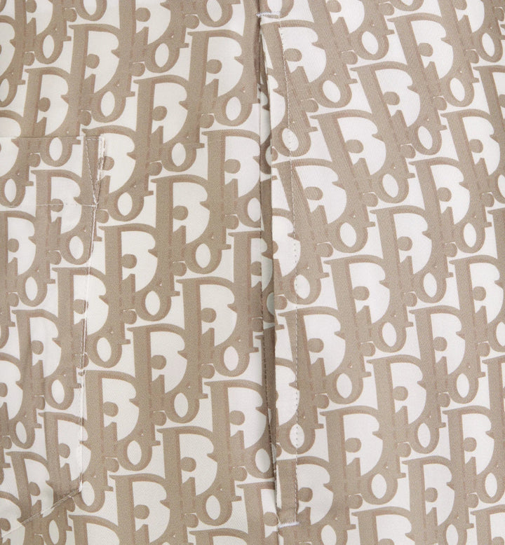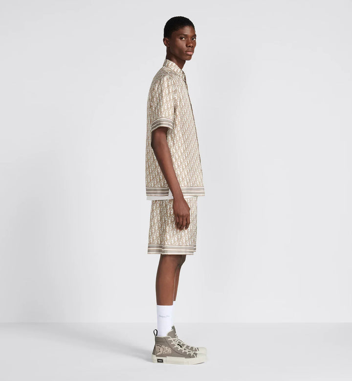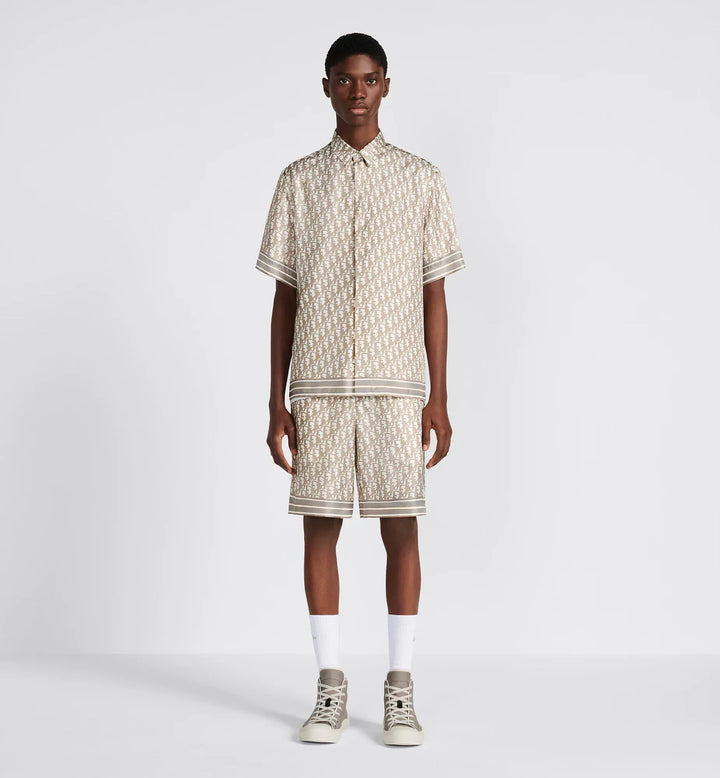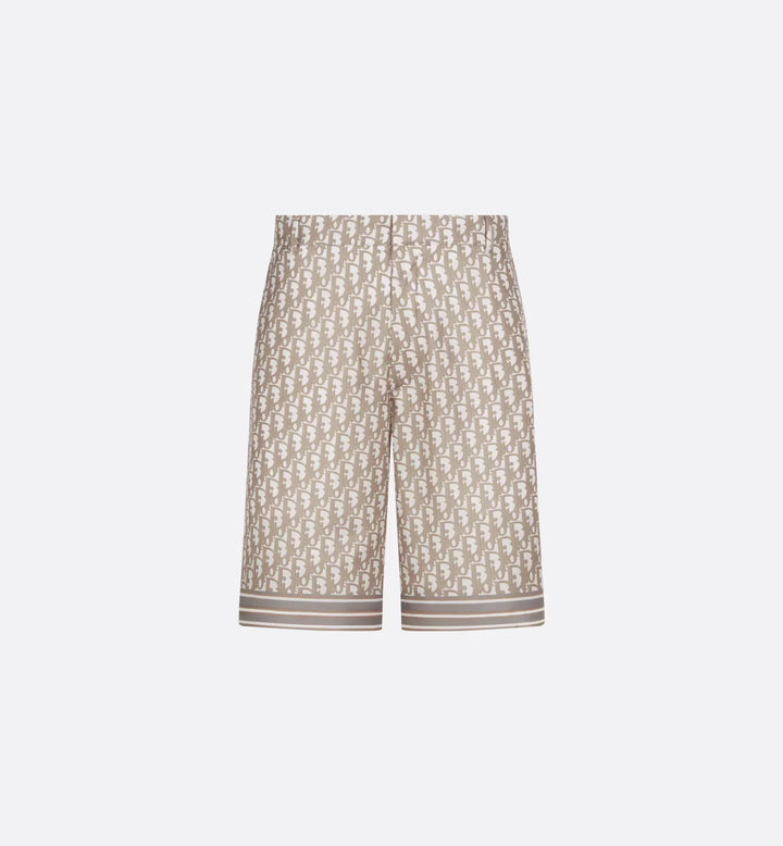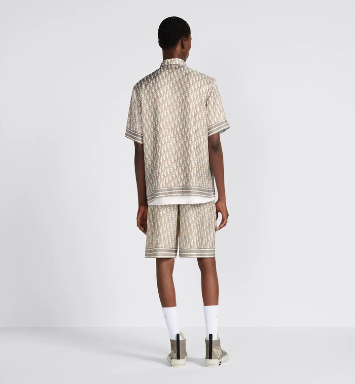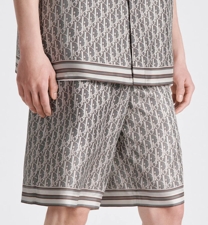 The Bermuda shorts highlight the House's hallmark Dior Oblique motif. Crafted in gray silk twill, they have a striped hem, side welt pockets and a rear patch pocket. Featuring a relaxed silhouette and mid-rise waist, the style can be paired with the matching shirt.